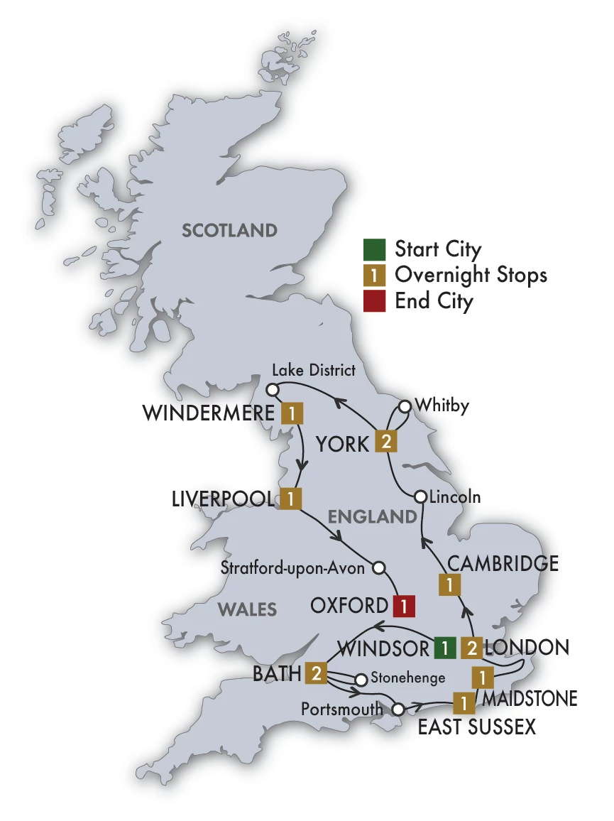 Explore Lincoln, with its towering cathedral and castle overlooking the city, then enjoy a traditional Sunday roast in a local pub. Take a walking tour in York, a medieval city of narrow cobbled streets, charming tearooms, quaint pubs, and intriguing churches. The rest of the day is free for exploring. (B, L)