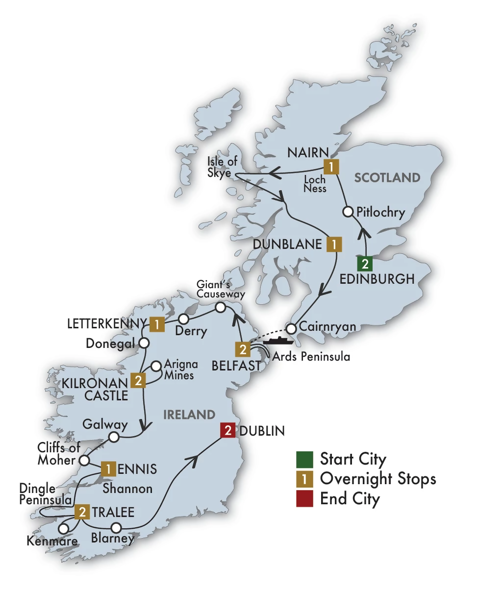 Day 5 Stirling Castle & Ferry to BelfastTour Stirling Castle, perched on volcanic rock above the town, and explore the richness of this 16th-century palace that was once home to Mary, Queen of Scots. Drive on through southwestern Scotland to Cairnryan and board the ferry to Belfast, where you’ll dine at your hotel this evening. (B, D)
