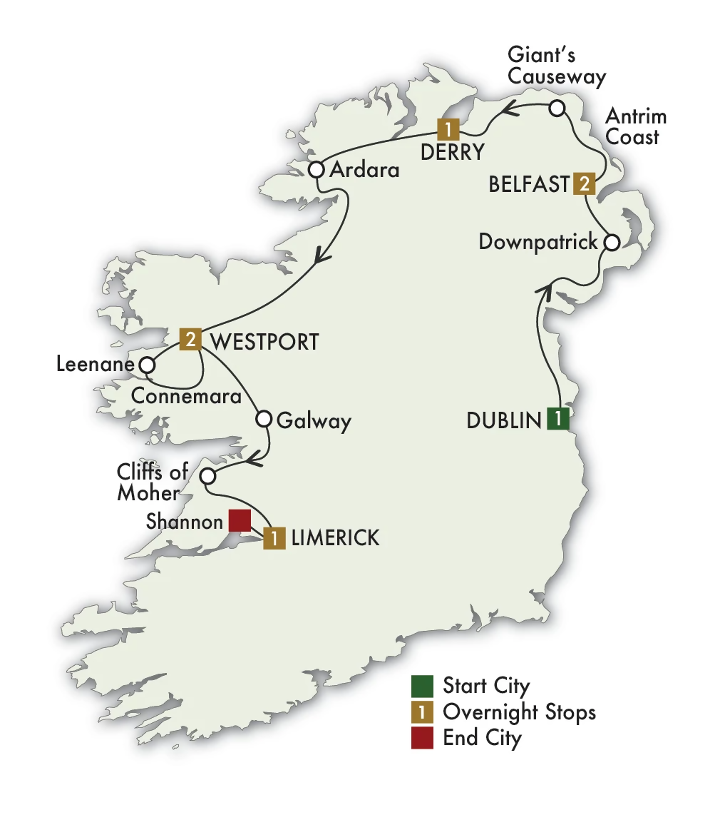Day 8 Tour Ends in LimerickYour tour ends after breakfast. (B) B: Breakfast; L: Lunch; D: Dinner>
