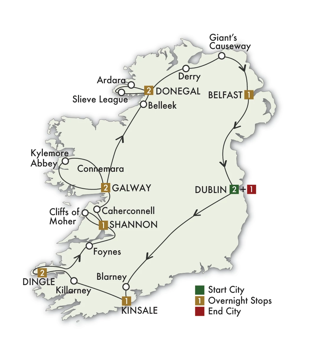 Day 13 Tour Ends in DublinYour tour ends after breakfast. (B) B: Breakfast; L: Lunch; D: Dinner>