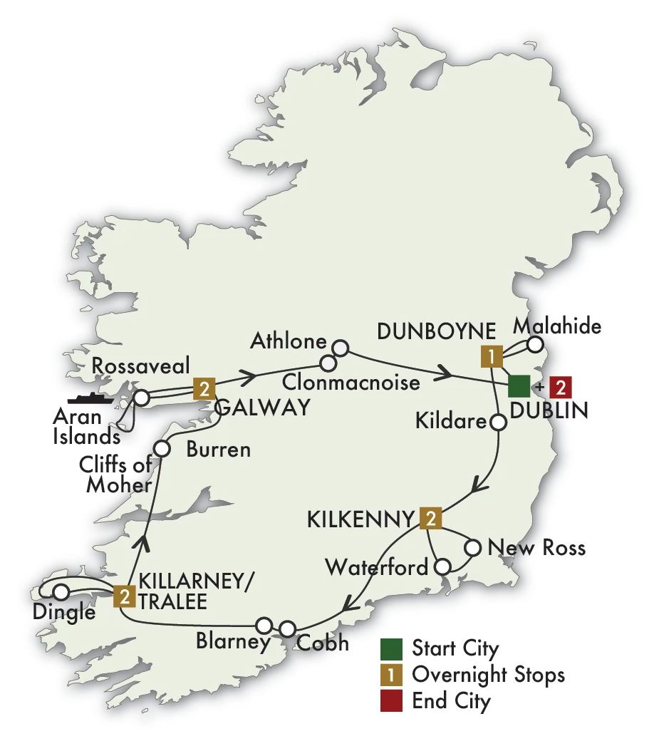 Day 1 Dublin Arrival & Malahide CastleYour tour departs at 2:00 PM from Dunboyne Castle Hotel. Start your vacation with a visit to Malahide Castle, first built in 1185 and filled with medieval artifacts. Enjoy a welcome drink with your group before dinner at your hotel. (D)