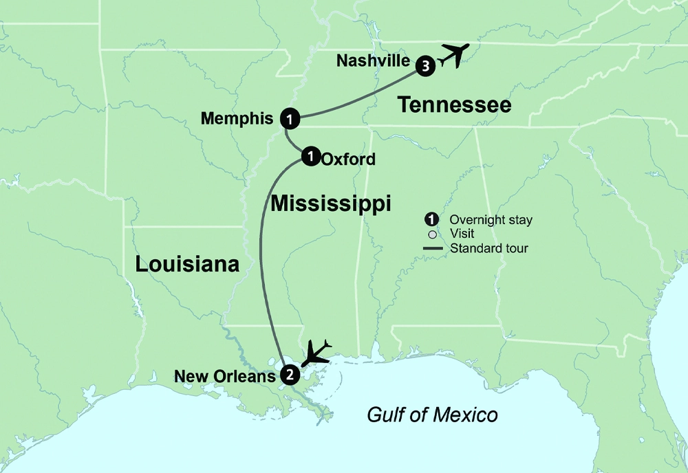 Travel north to Memphis, the birthplace of the Blues, Rock ‘n’ Roll, and Soul. Enjoy Southern hospitality at your hotel before jiving along to “Jailhouse Rock” as you visit Graceland, the stately mansion of the “King” himself, and tour Elvis’s 14-acre estate, including his home, private jets, and Meditation Garden.