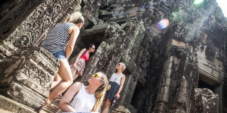 Explore the legendary temples of Angkor Wat and Angkor Thom with your Solo-ish travel crew, Take a sunrise riverboat ride through the jungles of the Cardamom Mountains in search of wildlife, Swim in turquoise waters and unwind on the white sands of Koh Rong Island