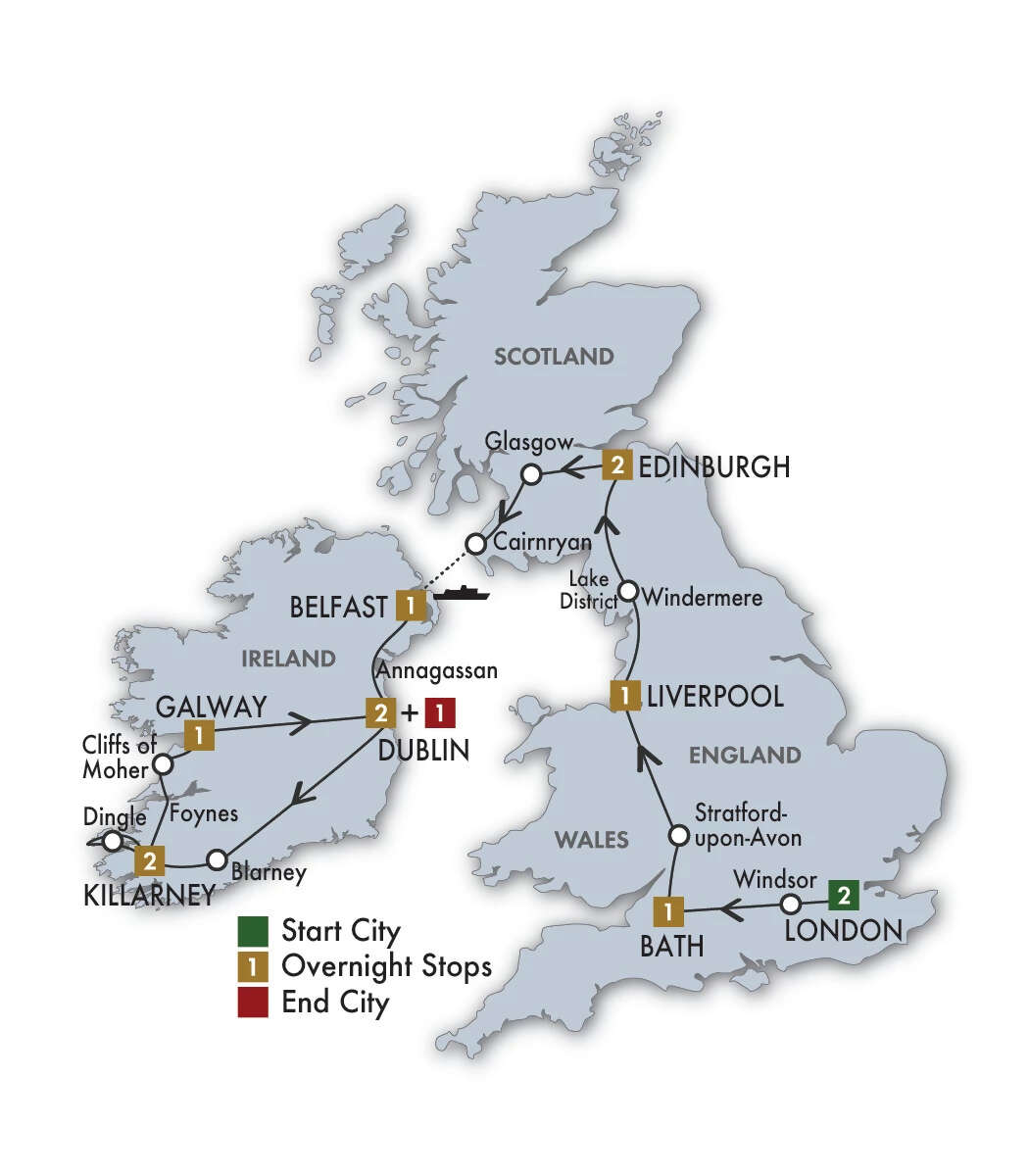 Travel to Glasgow for a city tour and then some time to explore this thriving cultural hub. Then, travel through scenic countryside for a short ferry ride to Ireland and arrive at your Belfast hotel. (B, D)
