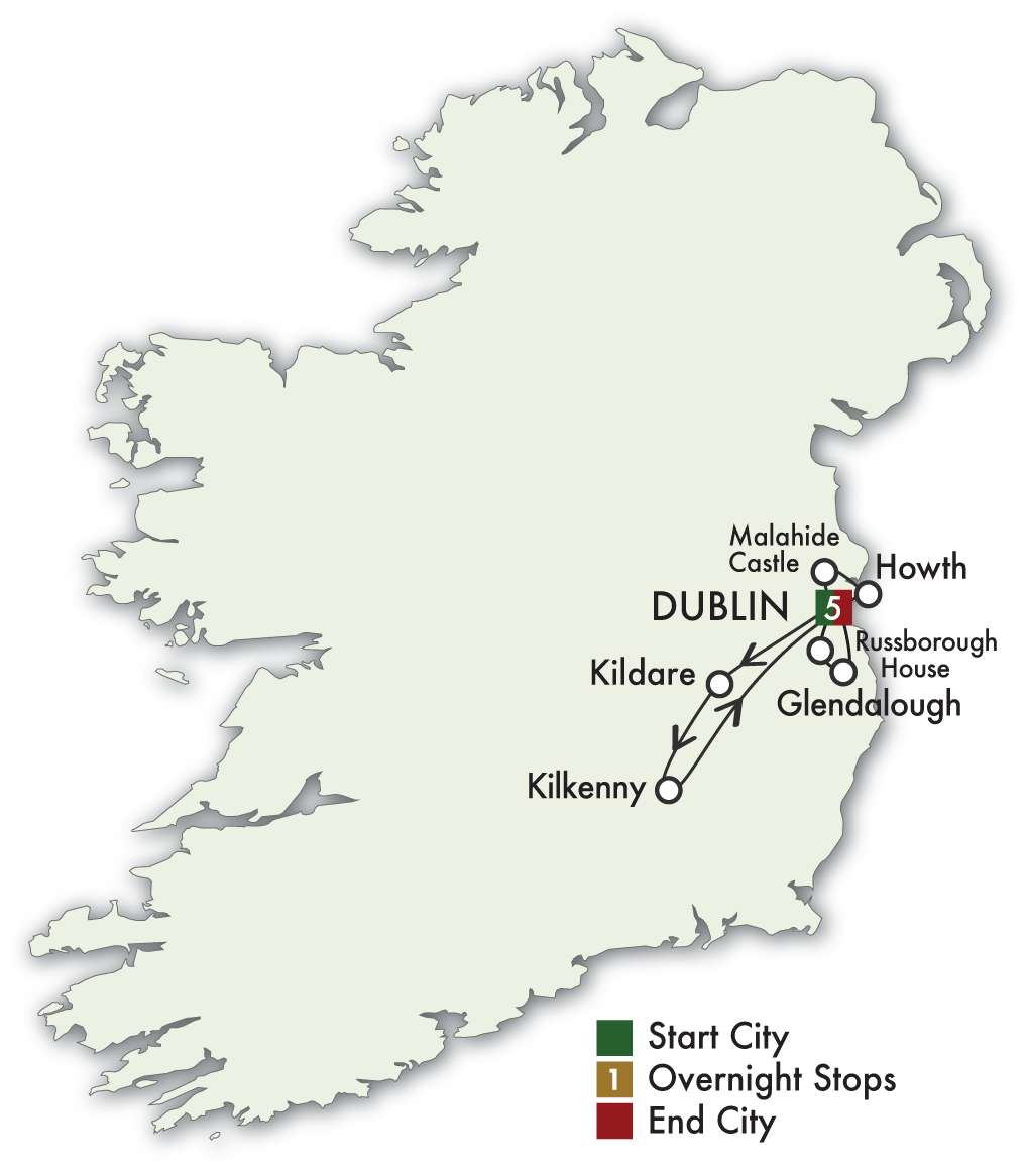 Enjoy the delightful scenery of the Wicklow Mountains on the way to Glendalough. Explore the remains of one of the most important monastic sites in Ireland, founded by St Kevin in the 6th century. Walk through the deep valley to view the picturesque ruins of a round tower, churches, and Celtic crosses. Next, visit Russborough House for a tour of this elegant, 18th-century home with a remarkable art collection. The house is set on 200 acres of parkland and you’ll enjoy a demonstration by skilled sheepdogs as they show their talents in herding their flock. The rest of the day will be yours to explore and dine in Dublin. (B)