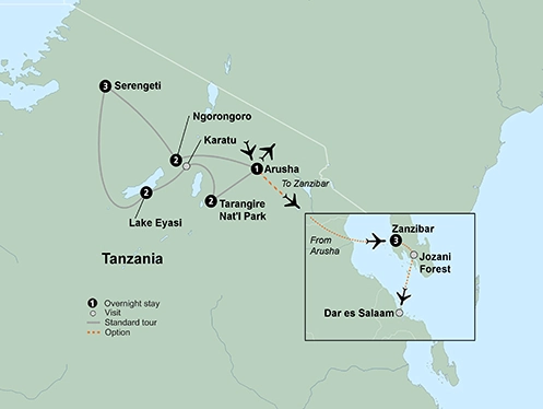 Stand in awe of the vast panoramas of Tanzania, a land of untouched landscapes, diverse wildlife and welcoming people. Get acquainted with the people and the food at Gibbs Farm, a historic coffee and vegetable farm. Continue on to Ngorongoro Crater, a large volcanic caldera and known as one of the seven natural wonders of Africa. Spend time in the Serengeti taking in five game drives, including two in the early morning to catch a glimpse of the wildlife returning from a night of hunting. Discover stunning Lake Eyasi, a beautiful oasis in the bush that boasts a tropical ecosystem. Gain a real insight into the way of life of some of Tanzania’s fascinating tribe. Meet the Datoga tribe – skilled farmers, craftsmen and blacksmiths, and the Hadzabe tribe – learn how they hunt and live off the land. Explore Tarangire National Park, famous for its elephant migration and quiet atmosphere.